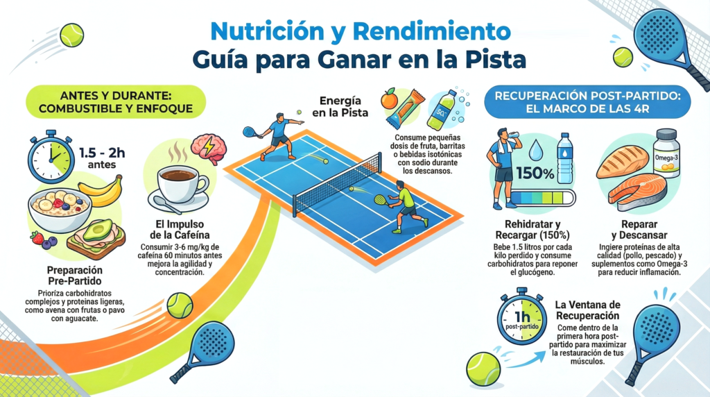 Traducción a cancha: si tu hidratación y tu energía están inestables, te vuelves más propenso a errores tontos: mala selección de golpe, tardas en reaccionar, te frustras más rápido.
